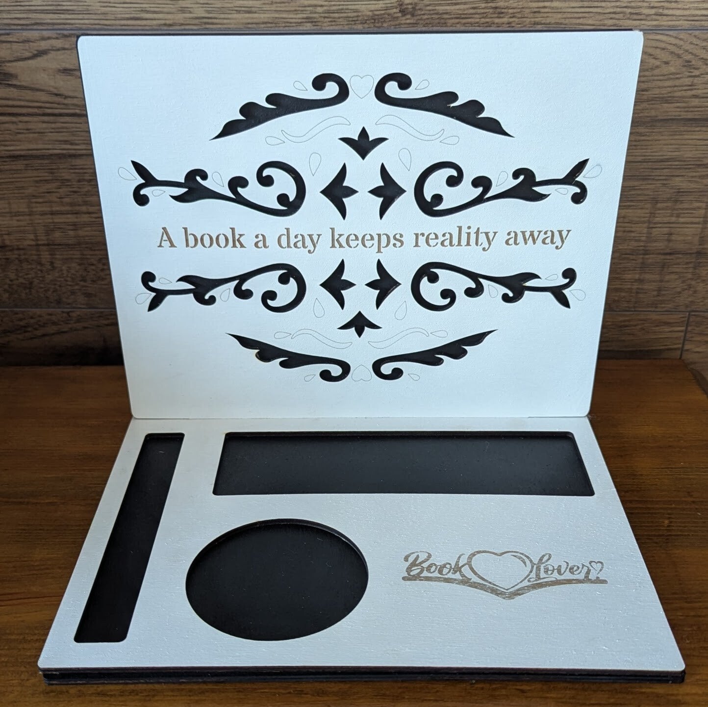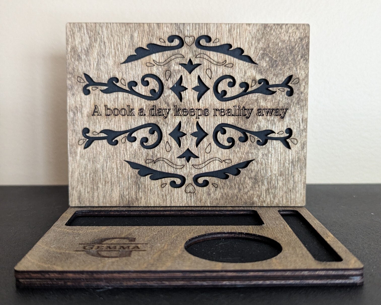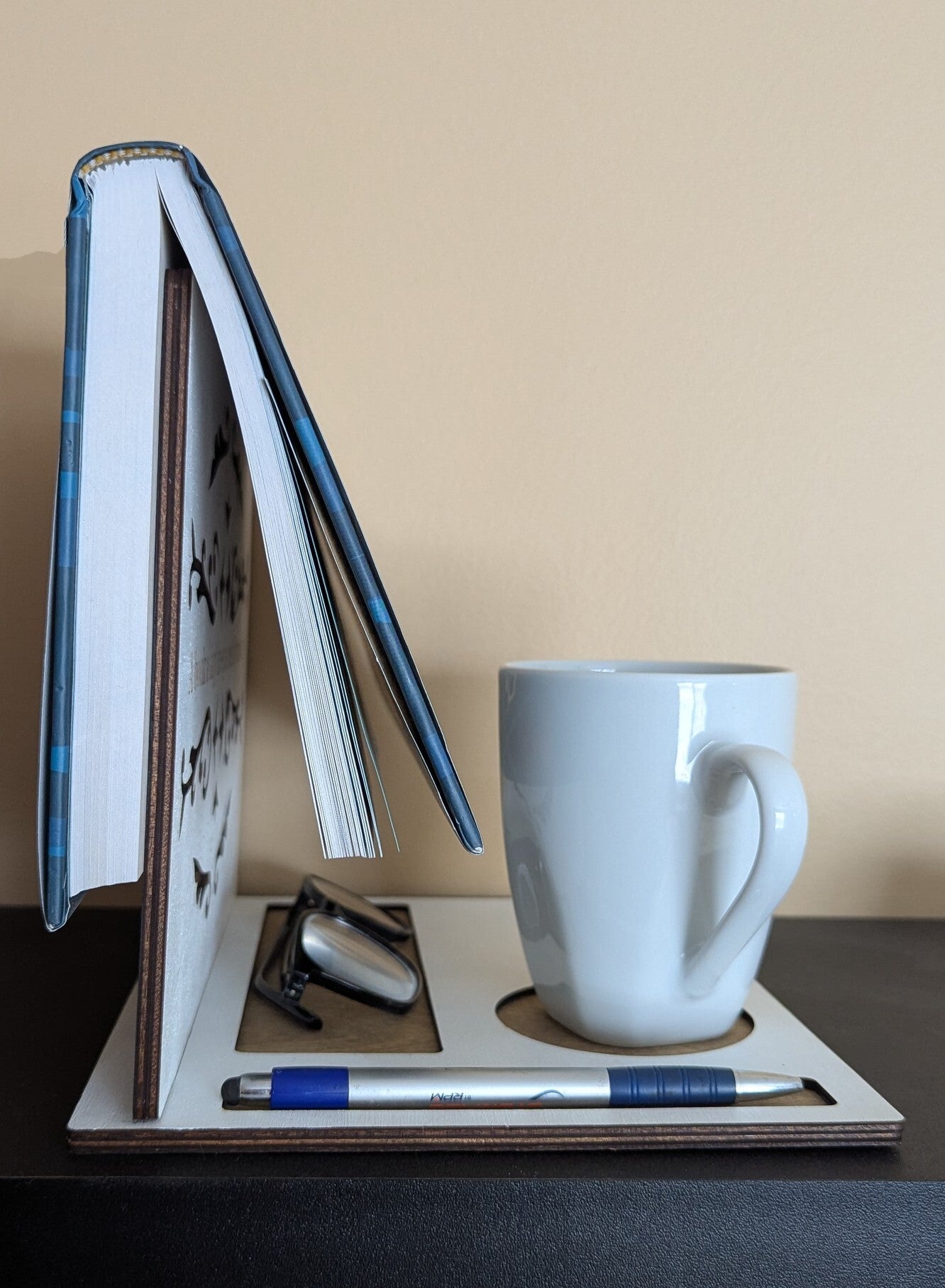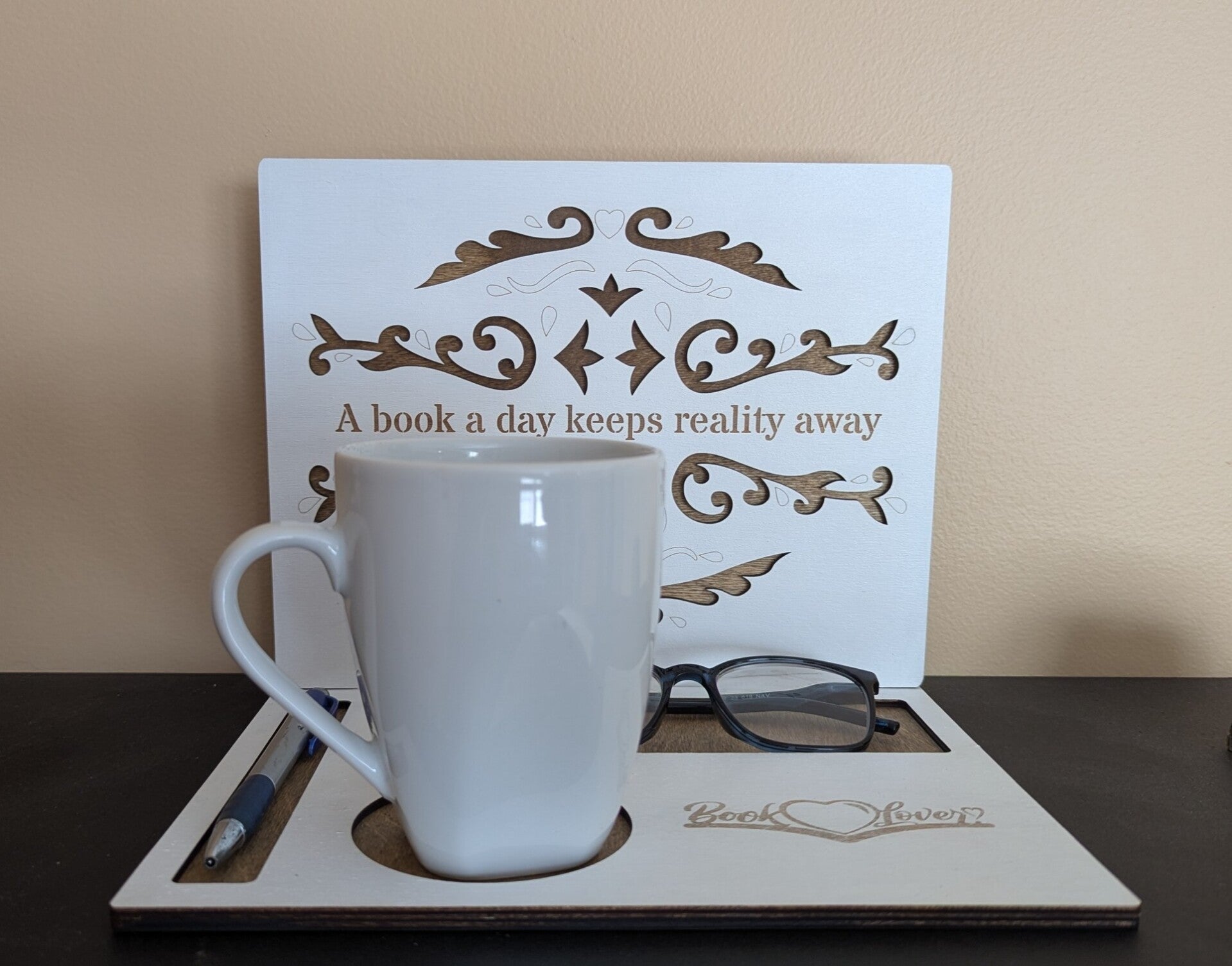This convenient and customizable book caddy functions as a holder for your cup, glasses and pen, while also serving as a placeholder for your book. It would make an excellent gift for someone who loves to read.
