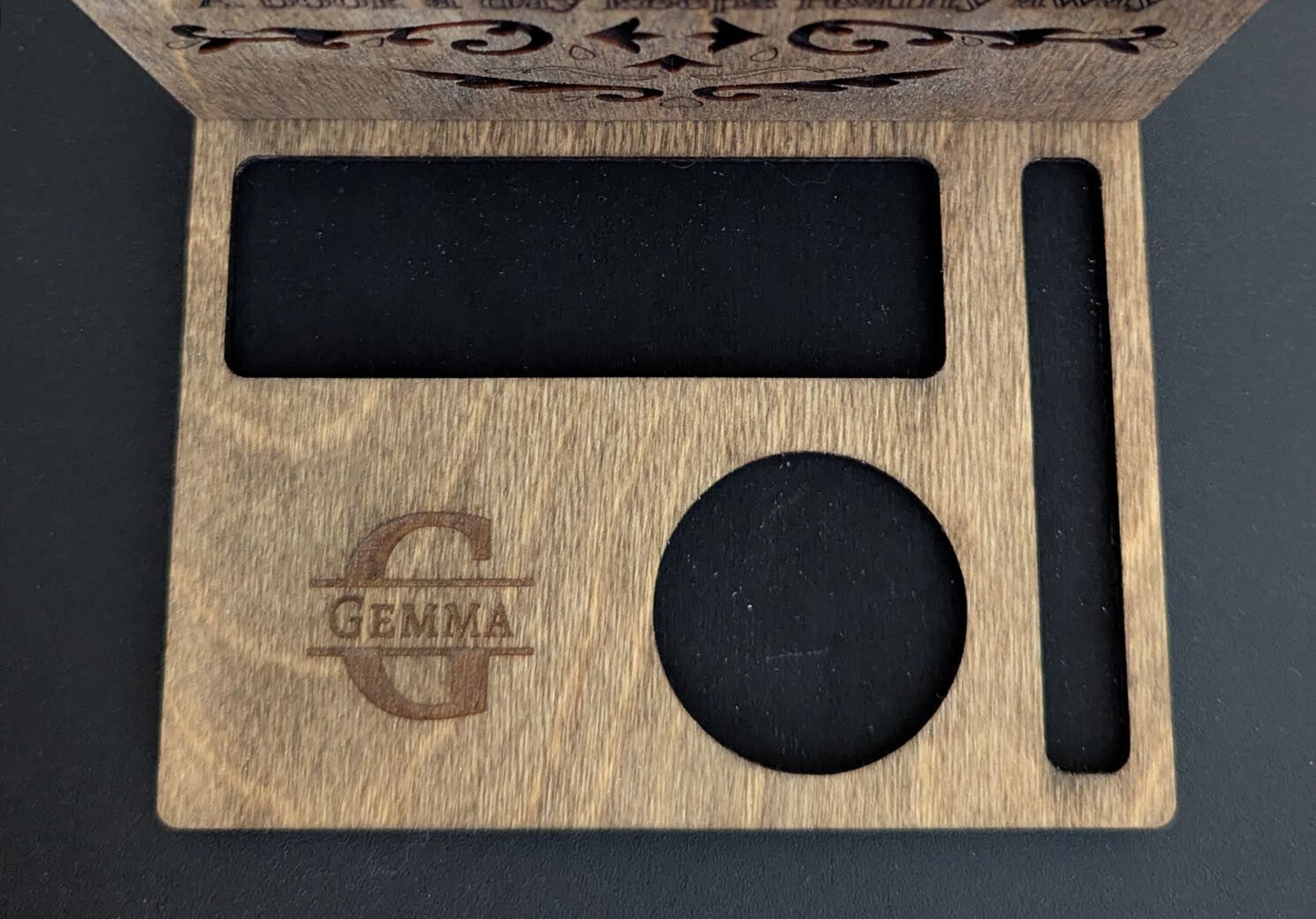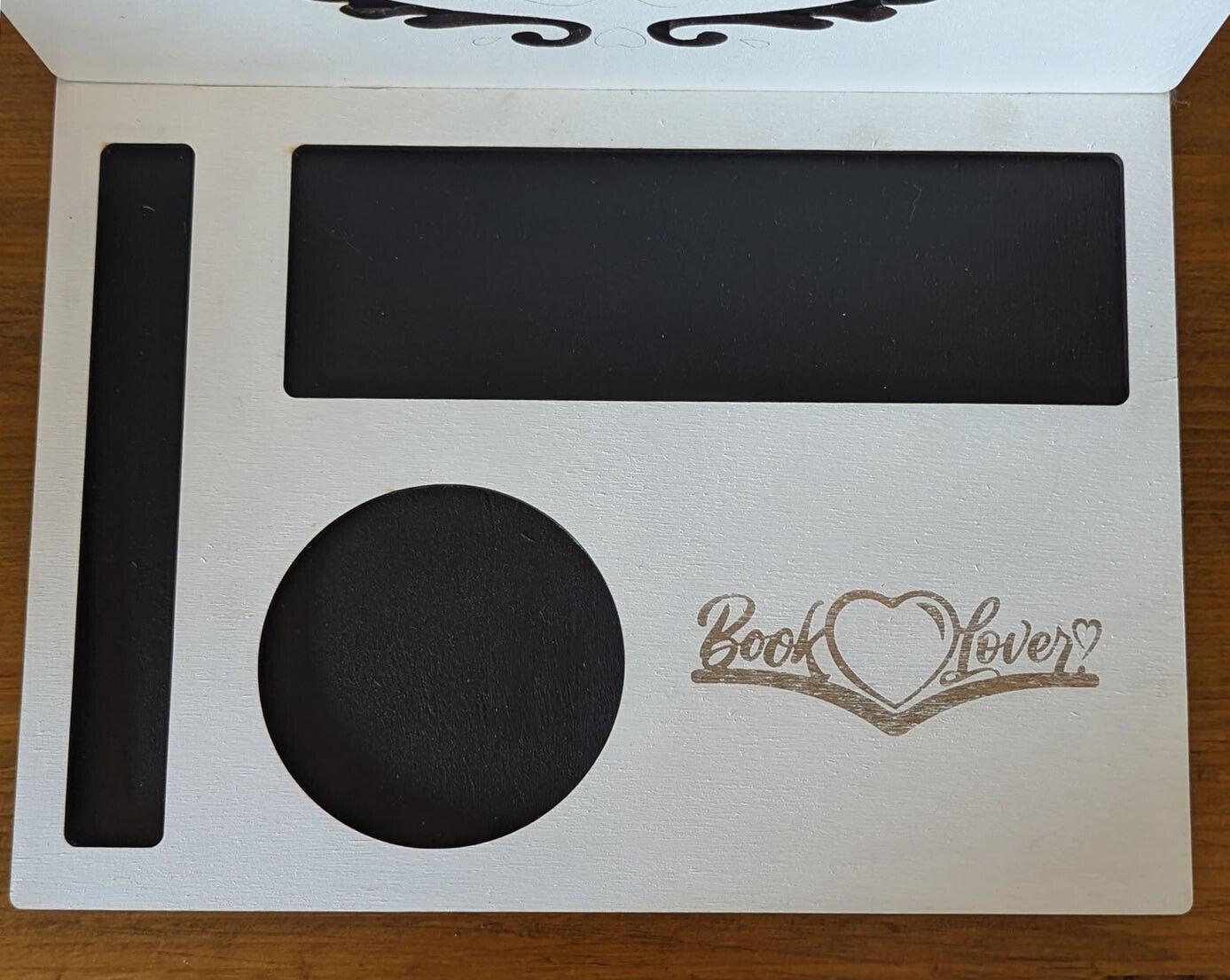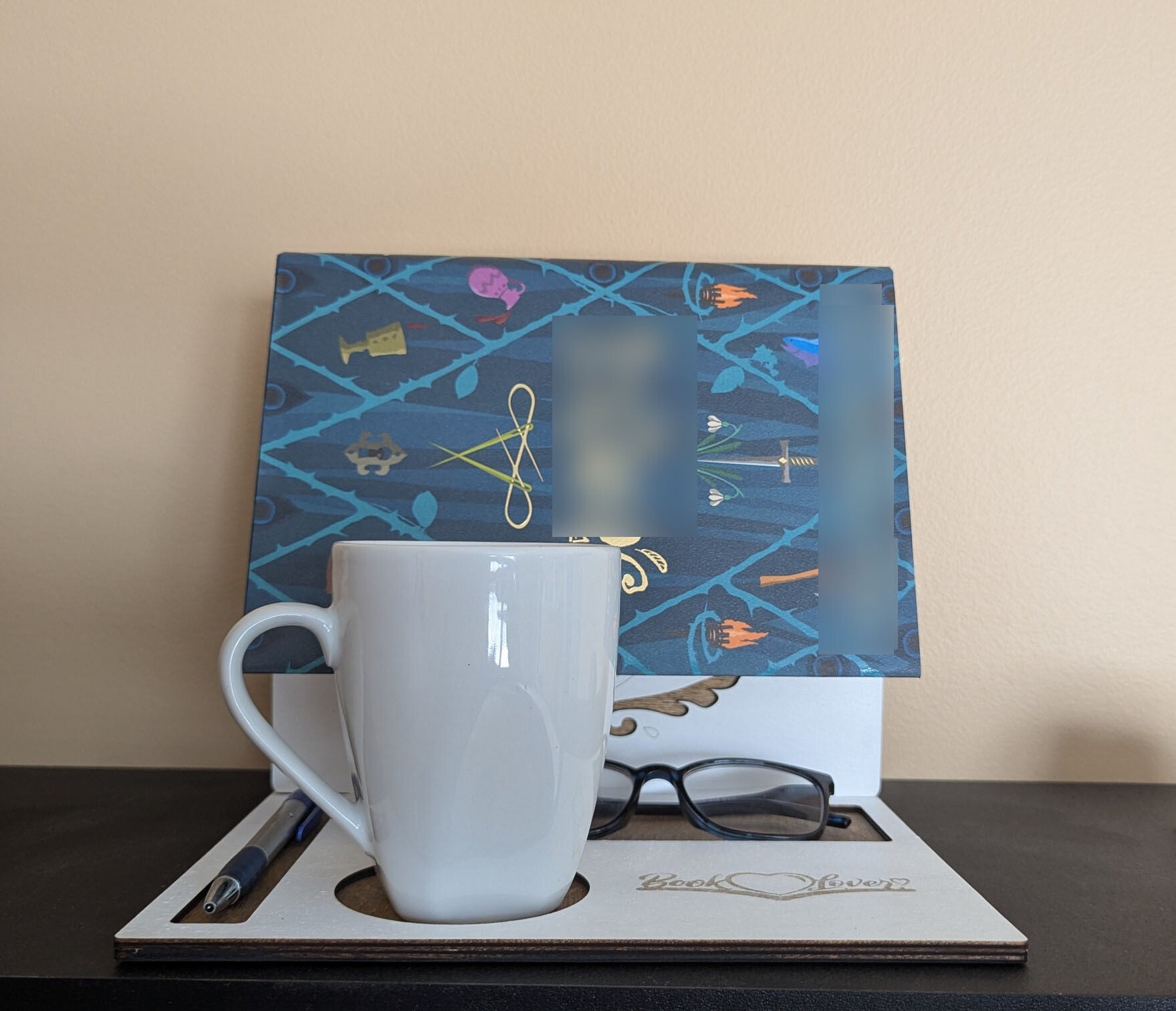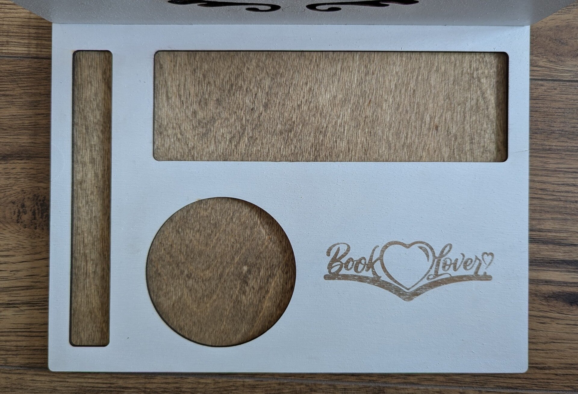 This convenient and customizable book caddy functions as a holder for your cup, glasses and pen, while also serving as a placeholder for your book. It would make an excellent gift for someone who loves to read.